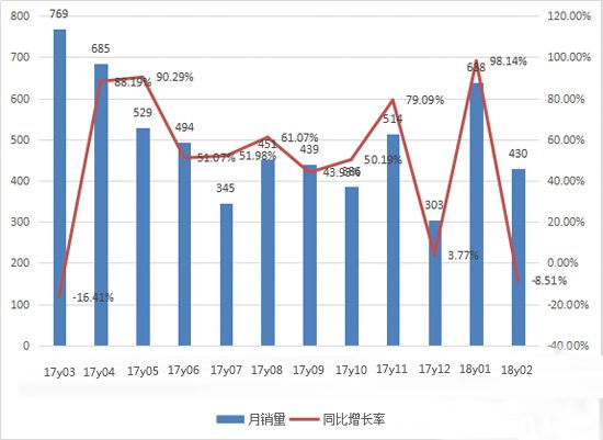 2017年3月至2018年2月推土機(jī)月銷量及同比增長情況